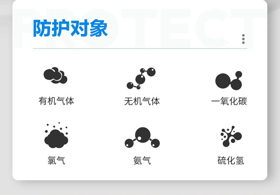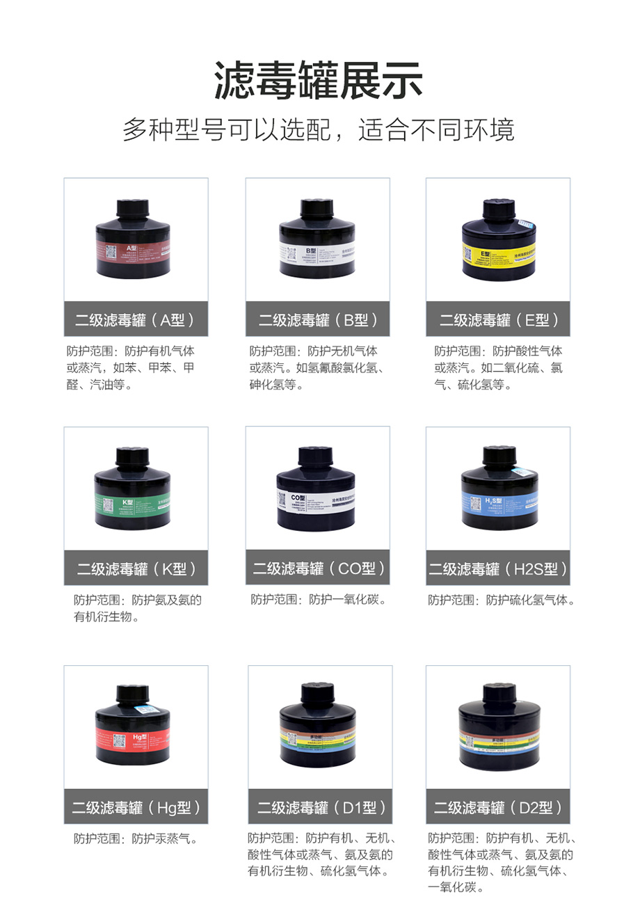 防護范圍:主要防護有機、無機、酸性氣體或蒸汽、氨及氨的有機衍生物、一氧化碳、硫化氫氣體