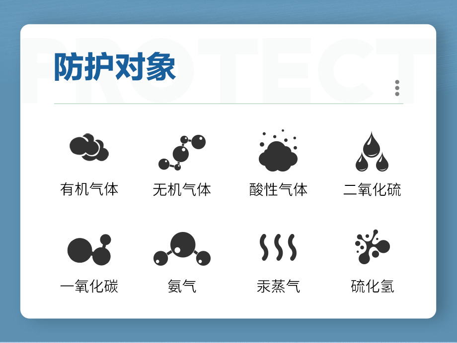 防護范圍:主要防護有機、無機、酸性氣體或蒸汽、氨及氨的有機衍生物、硫化氫氣體、汞蒸氣、一氧化碳?xì)怏w