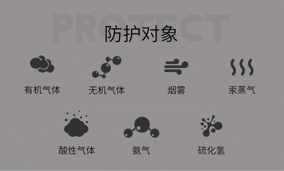 防護(hù)范圍:主要防護(hù)有機(jī)、無機(jī)氣體、酸性氣體、氨氣、硫化氫、汞蒸氣及煙霧