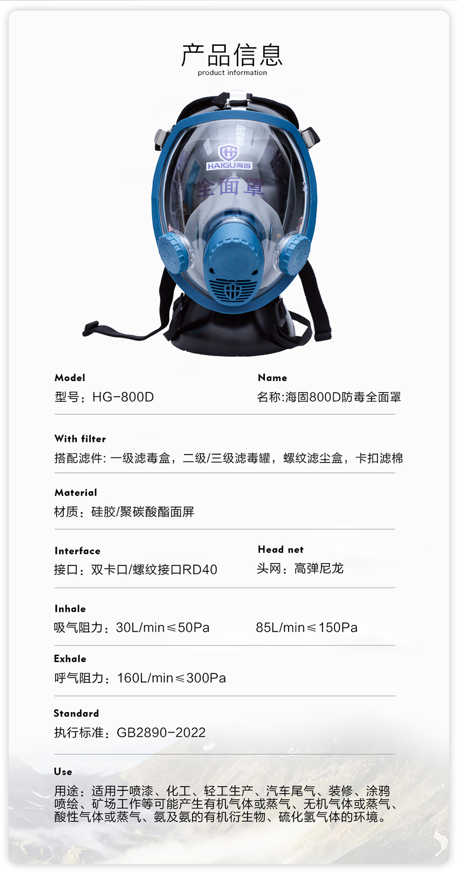 海固800D全面罩+HG-ABS/D-A/B/E/K/H2S-2濾毒罐 綜合防毒氣套裝